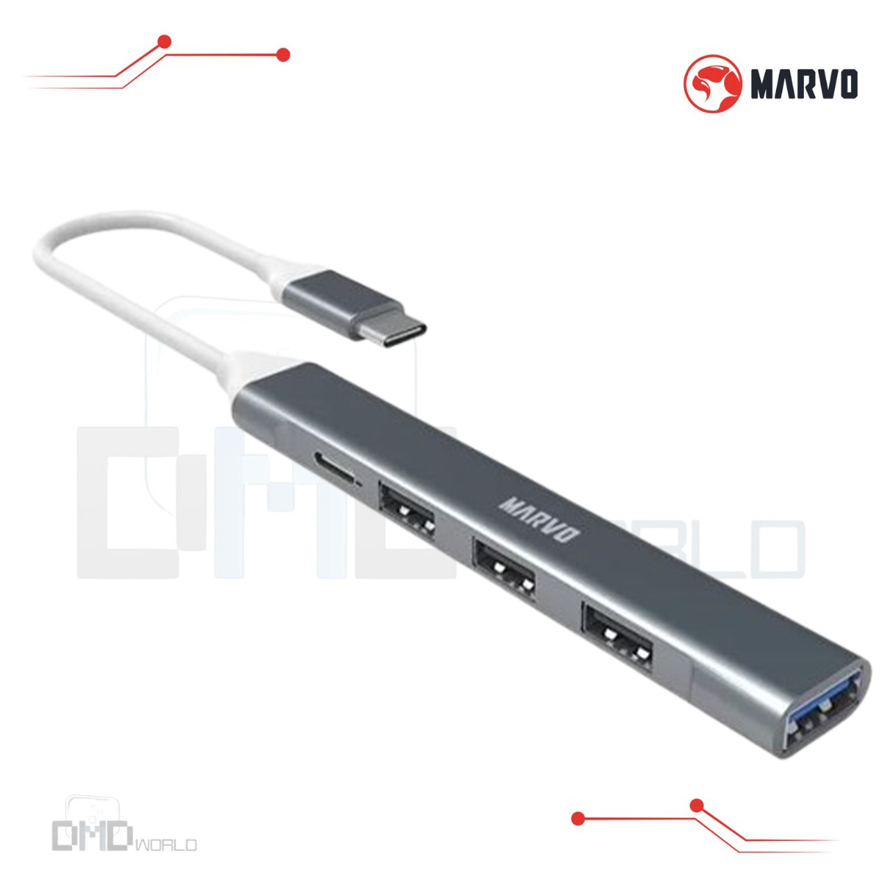 MARVO UH008 USB-C Hub | 1x USB 3.0 (5Gbps), 3x USB 2.0 (480Mbps), 1x USB-C Female, Metal Build, 15cm Cable, Plug & Play, 5V=3A Input, 102x16x7mm, 21g