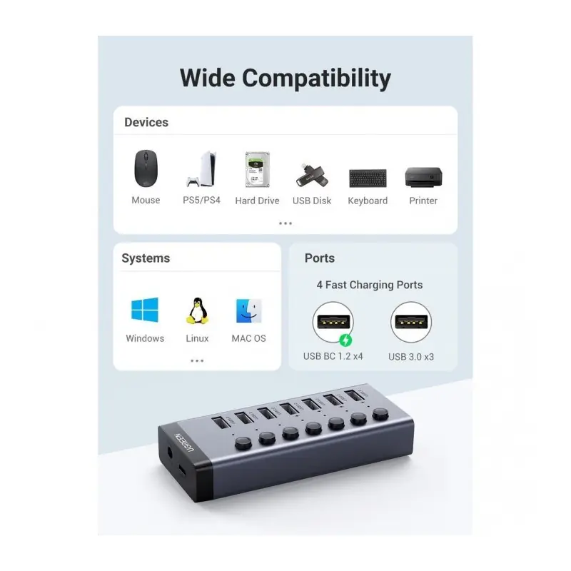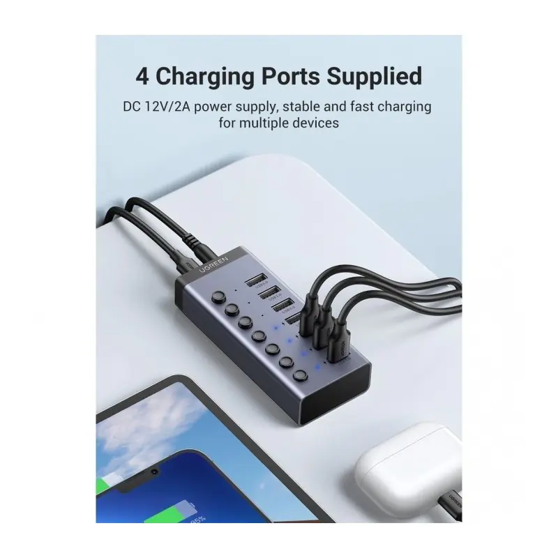 UGREEN USB-C To 7-Port USB-A 3.0 Hub With 4 Fast Charging Ports, DC 12V EU Adapter, 5Gbps Transfer Speed, LED Switches, Type-C Cable Included, Aluminum Shell